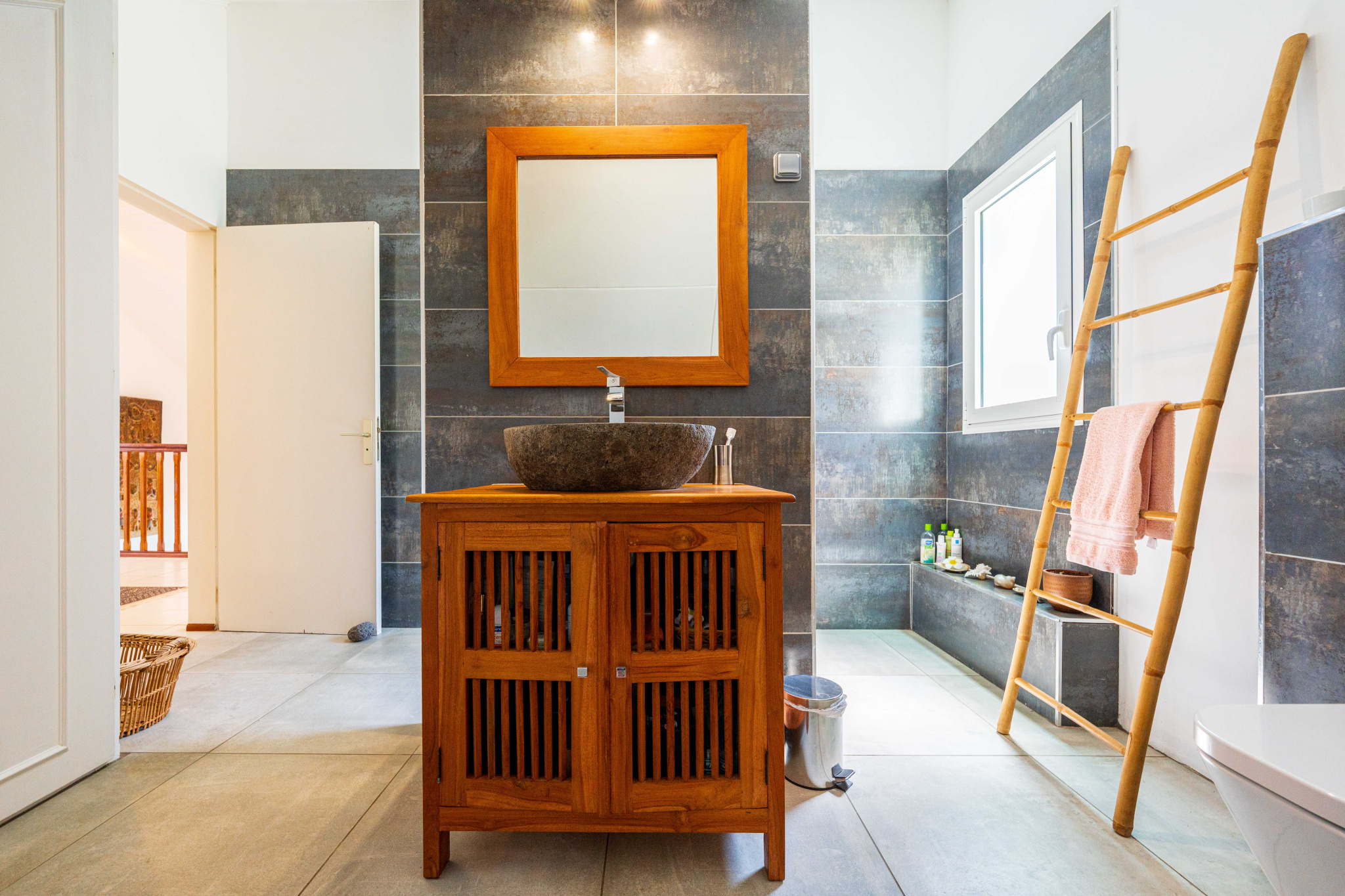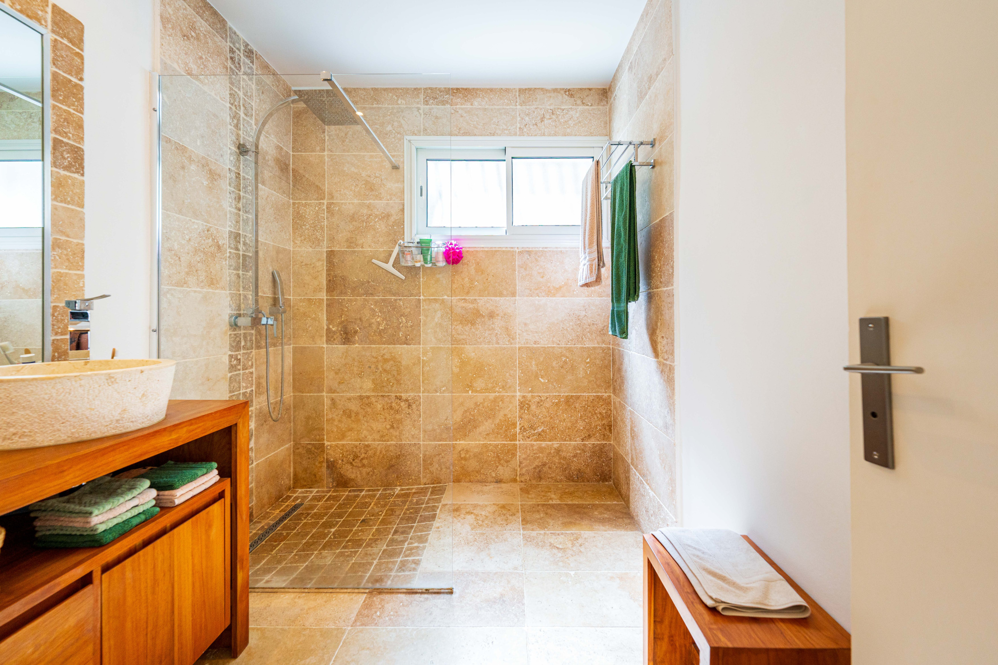 – Une salle d’eau en travertin avec double vasque