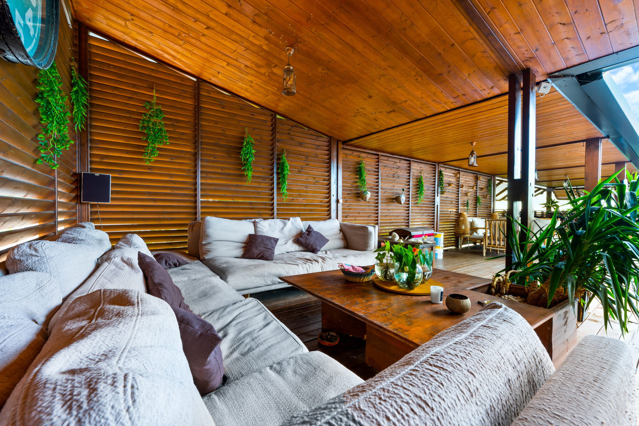 La vaste varangue de 75 m2 constitue un véritable espace de vie supplémentaire, idéal pour recevoir et profiter du climat tout en admirant la vue mer et en profitant de la piscine chauffée.