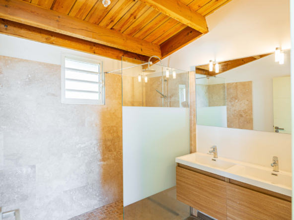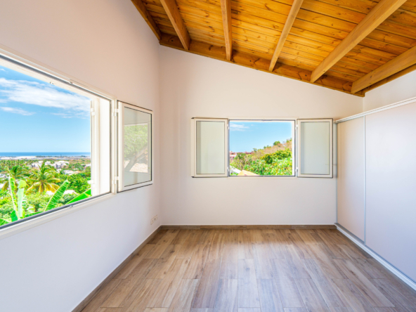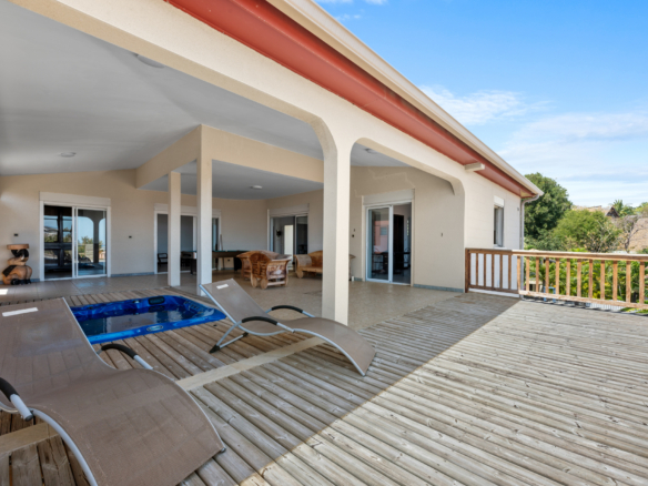 A l’extérieur, une varangue permettant d’admirer une vue mer et piscine et un grand garage.