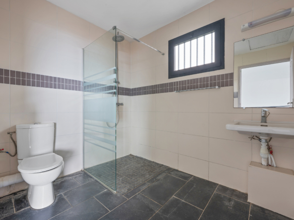 La villa est équipée d’un chauffe-eau solaire et raccordée au tout à l’égout.