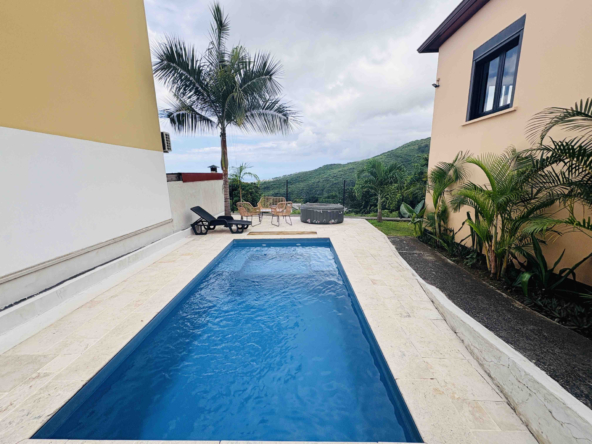 AMICASA IMMOBILIER vous propose à la location cette maison moderne louée meublée de type T4 avec piscine, développant 98 m2 habitables, complétée par une spacieuse varangue de 21 m2.