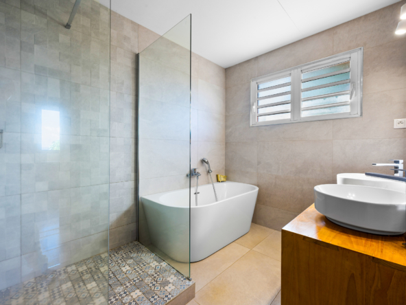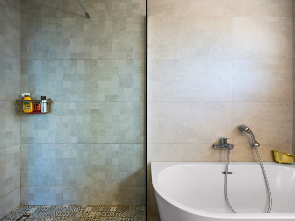 Grande salle de bain avec baignoire et douche