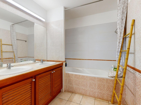 un séjour d’environ 18m2, une cuisine ouverte avec ilot central d’environ 13m2, un dégagement, des WC séparés, une salle de bain avec 2 vasques, 2 chambres climatisées.