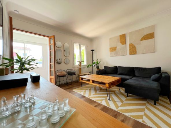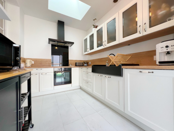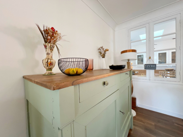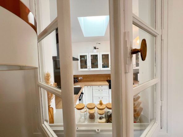 Construite en 1955, cette maison mitoyenne d’un côté a été entièrement rénovée avec goût par les propriétaires actuels. Elle allie le charme de l’ancien et le confort moderne.