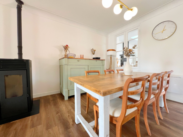 – Une spacieuse et lumineuse pièce de vie avec un poêle à granulés, comprenant un espace salon et une salle à manger conviviale,