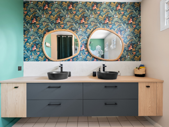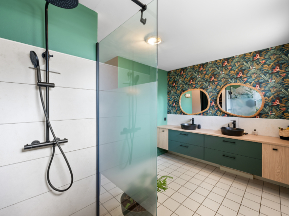 – Salle d’eau avec douche à l’italienne, double vasque + WC séparés.